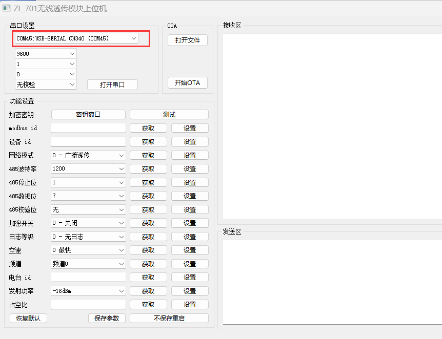 如下图所示打开串口参数为9600 8 1 无校验