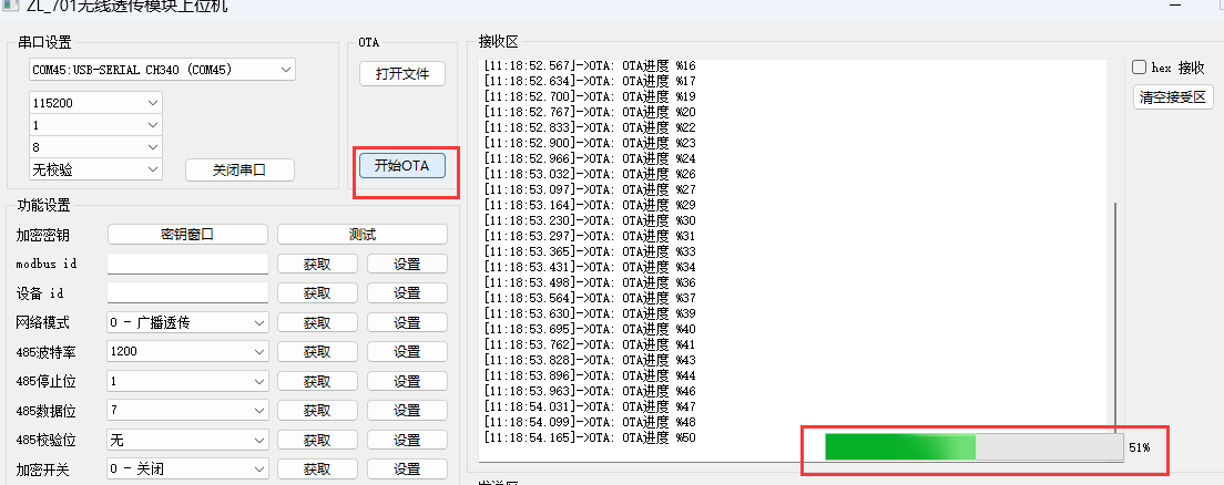 点击开始OTA 等待进度条到100% 即完成OTA升级