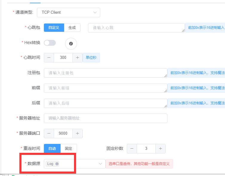 - 设置网络通道链接你的服务器,数据源选LOG。 基本参数下按需选择你的日志等级,和上位机打印一样